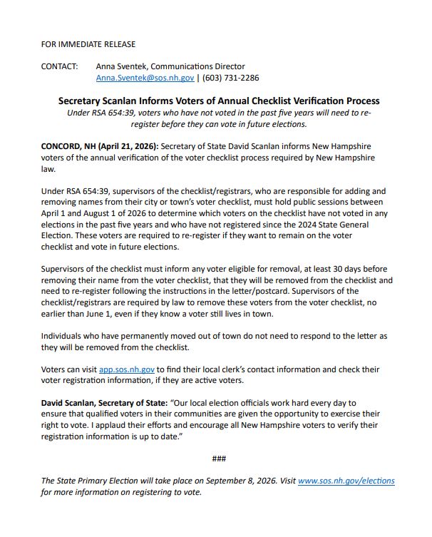 Voters can visit app.sos.nh.gov to find their local clerk’s contact information and check their voter registration information, if they are active voters. Click the link below to be directed to the New Hampshire, Secretary of State’s Voter Information page.